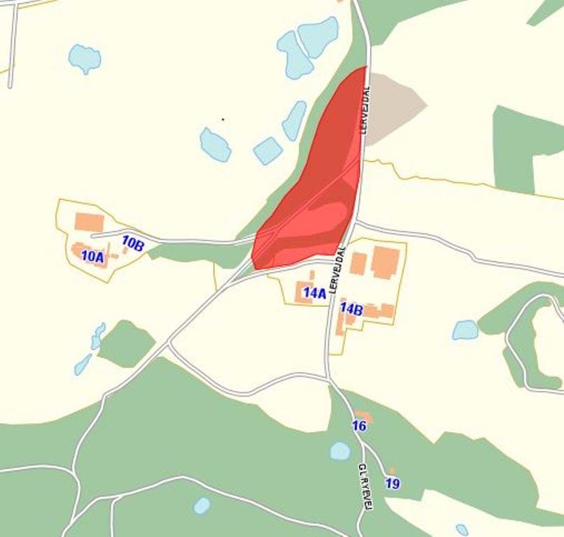 Naboejendommene Lervejdal 10, 14, 16 og 19, lokalplanområdet angivet med rødt