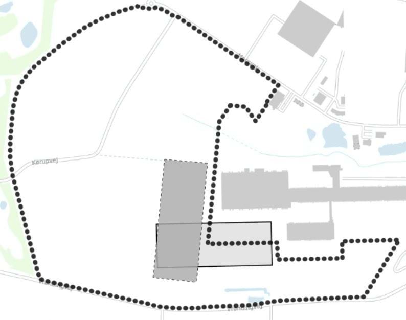 Lokalplanafgræsningen med byggefelt. Lysegrå er eksisterende byggefelt, og mørkegrå er nyt byggefelt.
