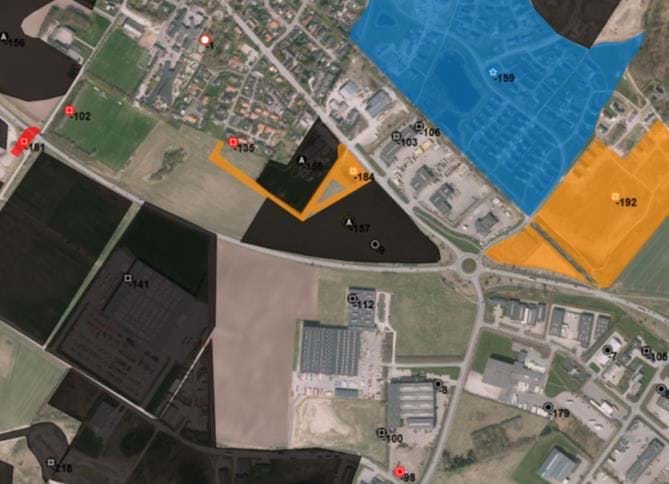 Arkæologiske registreringer i nærområdet. Lokalplanområdet er markeret med sort A midt i kortet. Ortofoto efter Fund og fortidsminder.