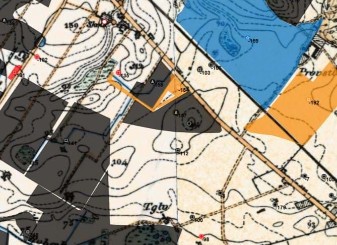 Arkæologiske registreringer i nærområdet. Lokalplanområdet er markeret med sort A midt i kortet. Højt målebordsblad efter Fund og fortidsminder.