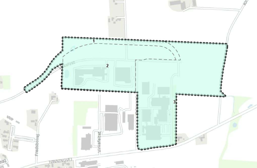 Kortbilag 1A - Lokalplandelområder Delområde 1 nyt vejforløb, Delområde 2 Virksomheder med 42 meter højt byggeri, Delområde 3 - Virksomheder med 20 meter højt byggeri