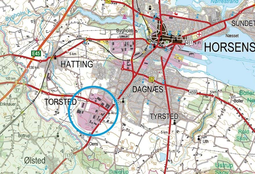 Erhvervsområde Horsens Syd ligger i den sydvestlige kant af Horsens By. Området er ca 2,5 km2 stort og varierer i terrænhøjde mellem kote ca. 50 i den nordøstlige del og ca. kote 40 i den sydvestlige del. Vestvejen passerer gennem området i en naturlig lavning og forbinder det med motorvej E45. Vejlevej udgør områdets afgrænsning mod øst. Der er eksisterende og planlagte boligområder tæt ved erhvervsområdet nordlige del, og mod syd ligger den lille landsby Oens. Derudover er der eksisterende fritliggende boliger øst og vest for området. Set fra det åbne landskab fremtræder lokalplanområdets større erhvervsbyggerier og enkelte skorstene tydeligt. Området fremtræder som et blandet erhvervsområde med enkelte arealer - særligt mod nordvest og sydvest - der endnu ikke er taget i brug til erhverv, som ikke er jordbrug. Mange af områdets byggerier og anlæg lever op til den nuværende lokalplans intentioner om smukt byggeri og karakterfuld beplantning. Langs enkelte af de interne veje er der karakterfuld træbeplantning, og mod syd og vest er lokalplanområdet afskærmet med et beplantningsbælte.