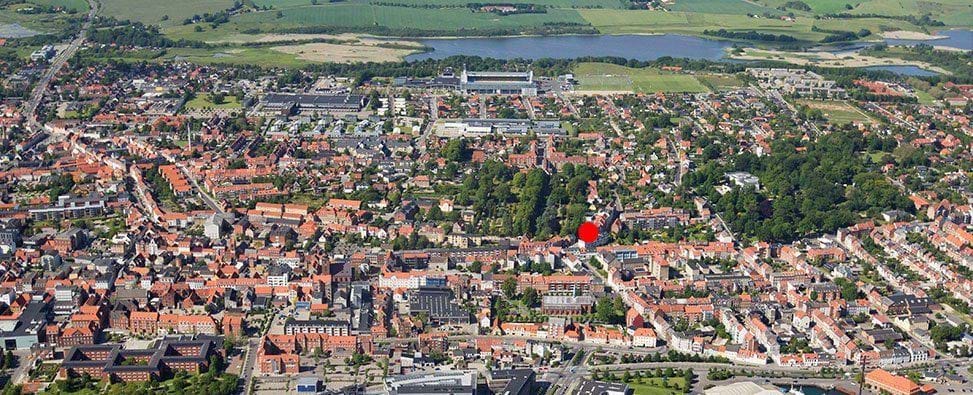 Luftfoto over Horsens by. Den røde markering viser lokalplanområdet, det grønne område til venstre for lokalplanområdet er Nordre Kirkegård