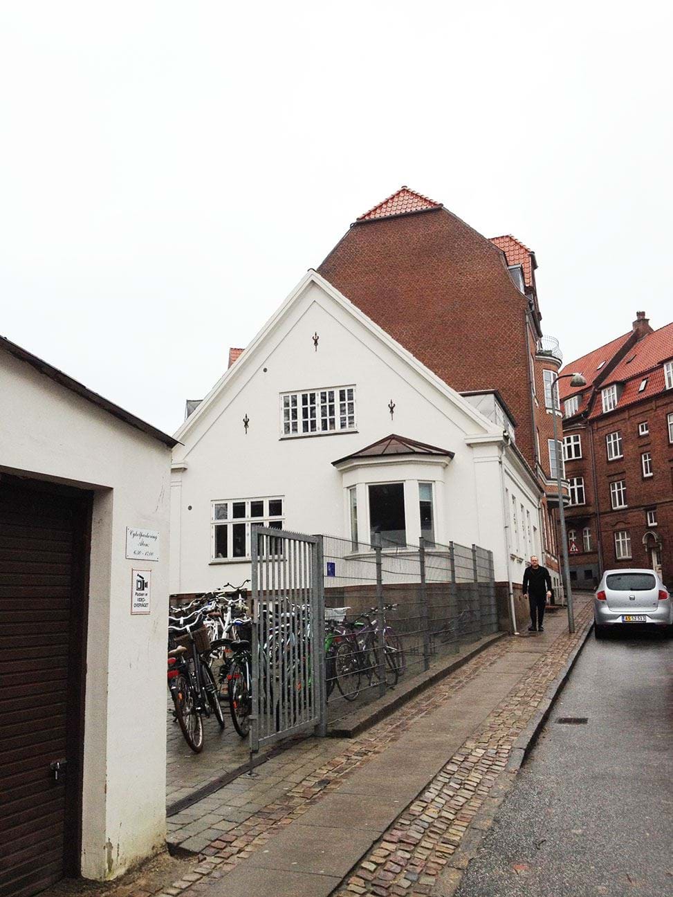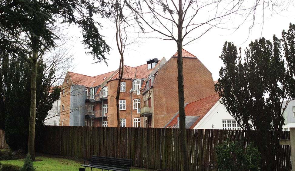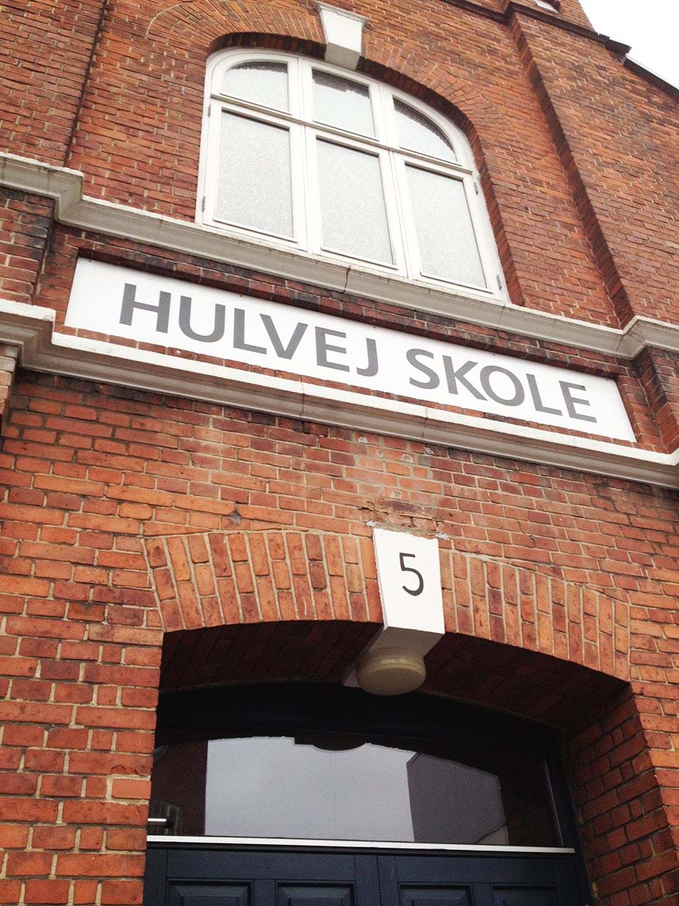 Hulvej Skoles facder mod skolegården - set fra Nordre Kirkegård