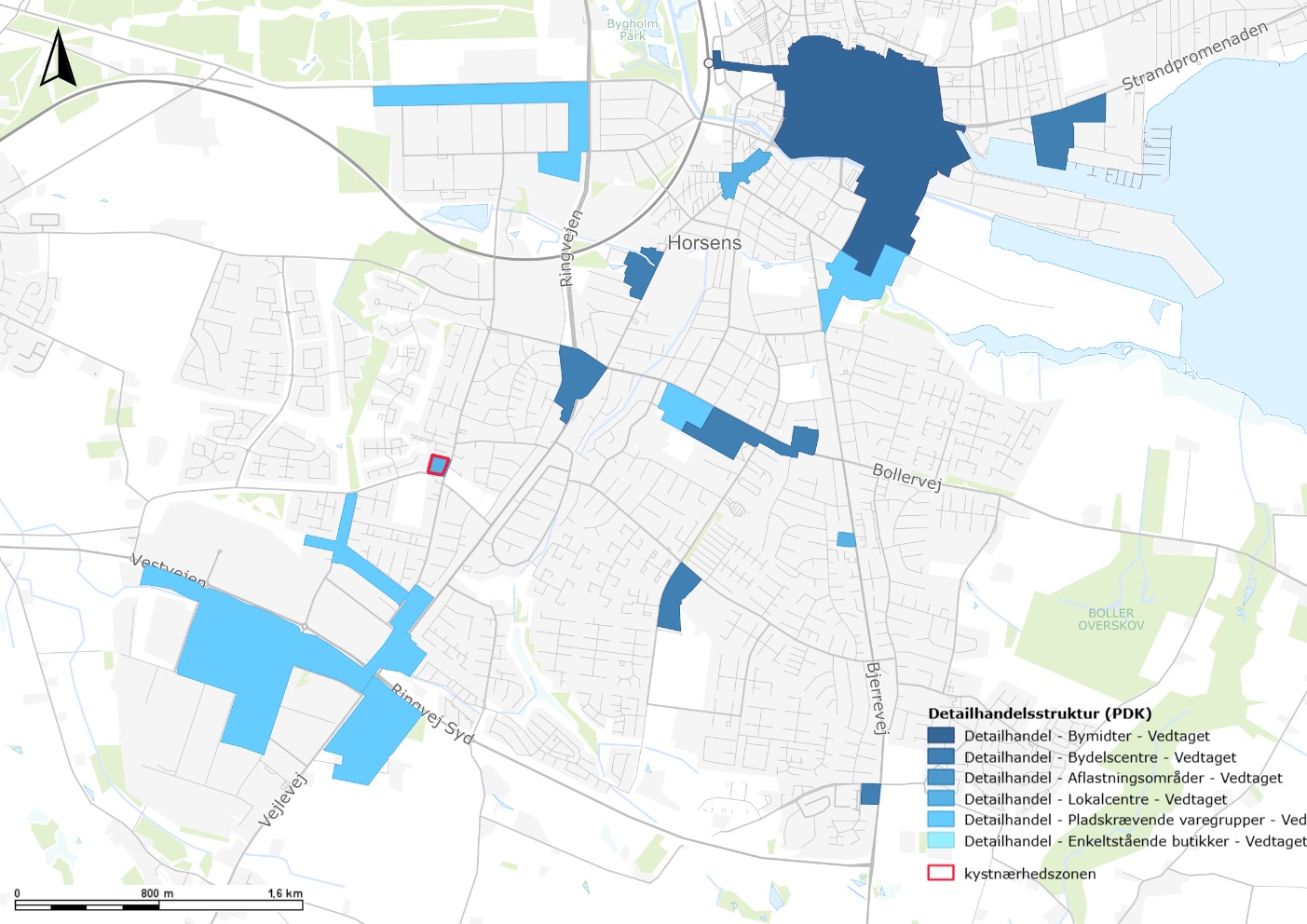 Lokalplanområdet er en del af kommuneplanens detailhandelsstruktur bestemt til lokalcenter. Detailhandelsstrukturen er udformet, så den understøtter bymønsteret i Horsens Kommune og dermed også det lokale opland.