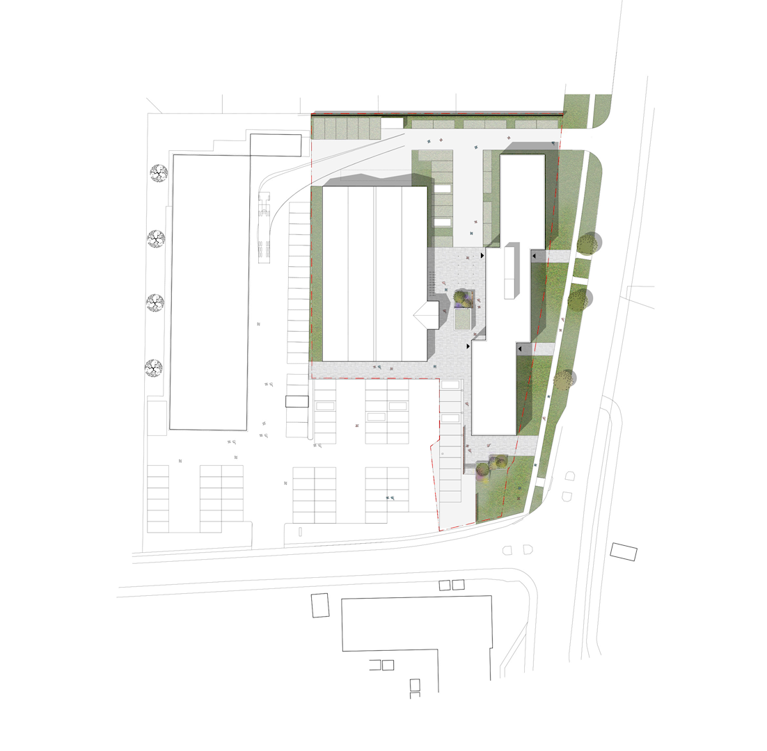 Illustrationen herunder viser, at etablering af cykelstien medfører en reduktion af 2 parkeringspladser, hvis parkeringsarealet får en anden disponering. Det er fortsat muligt at opfylde Horsens Kommunes parkeringsnorm.