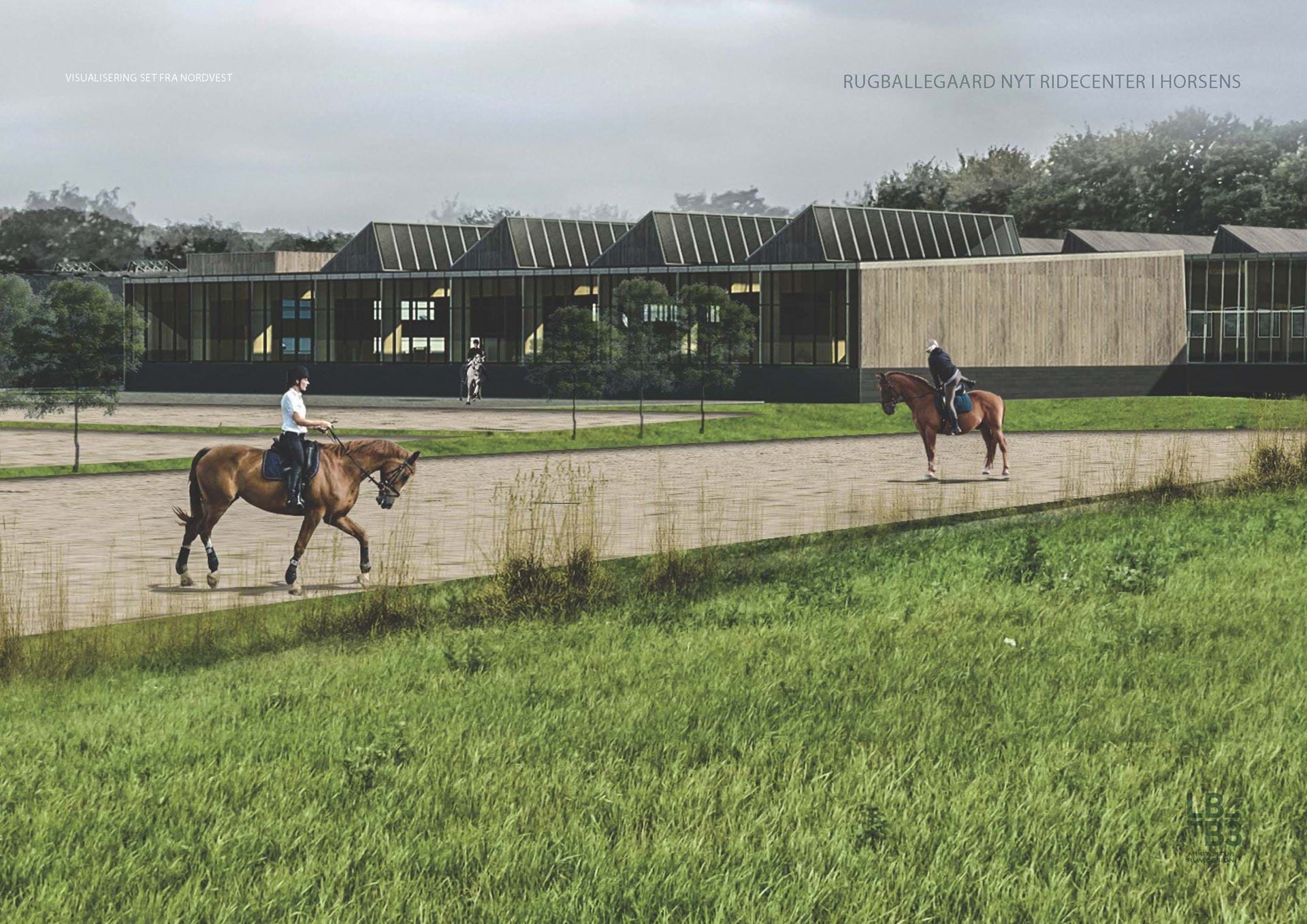 De nye ridehaller vil blive placeret, som det fremgår af illustrationsplanen. Ridehallen vil på grund af eksisterende beplantning og skovrejsning ikke, eller kun meget lidt; blive synlig fra Åbjerg Skovvej (nord for ridecentret) eller fra Stationsvej (vest for ridecentret). Den nye bygning indeholder to ridehaller samt mellembygninger indeholdende ankomst, cafeteria og rytterfaciliteter i forbindelse til hallerne. Cafeteriet er beliggende på 1. sal med direkte adgang dels fra det øvre niveau i forbindelsesgangen, dels via en trappe fra ankomstområdet. Fra cafeteriet er der direkte indkig til de to haller via vinduespartier, samt en indvendig trappe, der fører ned til publikumsarealet mellem de to haller. Endvidere er der en udendørs sydvendt terrasse. I adgangsniveauet, under cafeteriet, er der direkte adgang til ridehallerne, samt toiletfaciliteter. Hallerne indeholder to ridebanerer, med minimumsbredder på henholsvis 20 x 80 meter og 20 x 60 meter.
