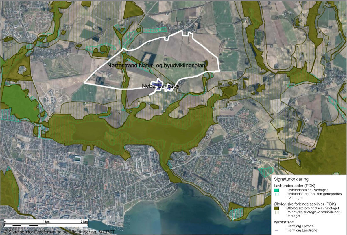 I udviklingsplanen for Nørrestrand er områderne inden for udpegningerne udlagt til grønne korridorer, samt naturudvikling, hvorfor der ikke er konflikt med udpegningen. I Tematillægget for Byudvikling">Byudvikling vil områderne blive udlagt til rekreative formål i rammer for lokalplanlægningen.