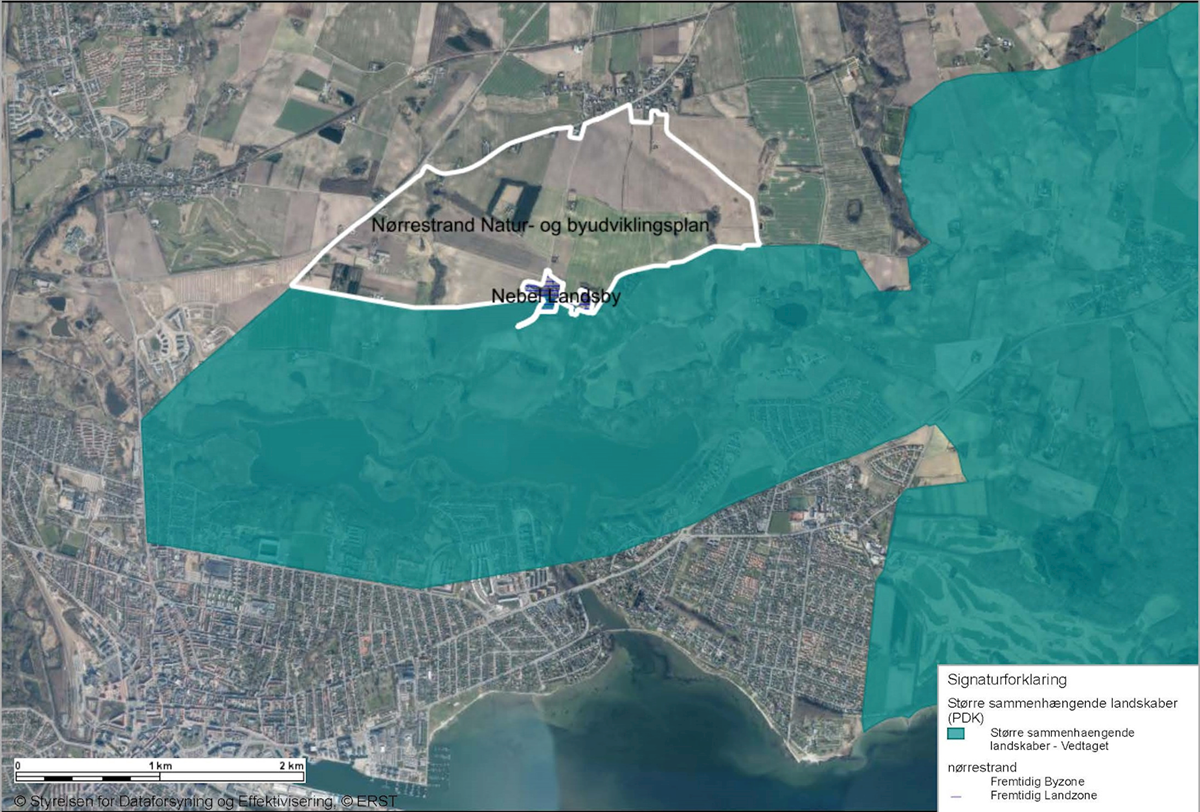 På baggrund af udpegningen større sammenhængende landskab og til bevaringsværdigt landskab reduceres arealet, der ønskes udlagt til byudvikling i forhold til det areal, der er udlagt til perspektivområde i Kommuneplan 2021- 2033, så det afgrænses af arealet, der er udpeget større sammenhængende landskab og til bevaringsværdigt landskab. Den eneste del af arealudlægget, som berør landskabsudpegningerne er ramme 17BE03, som er Nebel landsby. Den bevarende lokalplan for Nebel, fastholder at Nebel forbliver i landzone og dermed ikke inddrages til byvækst.