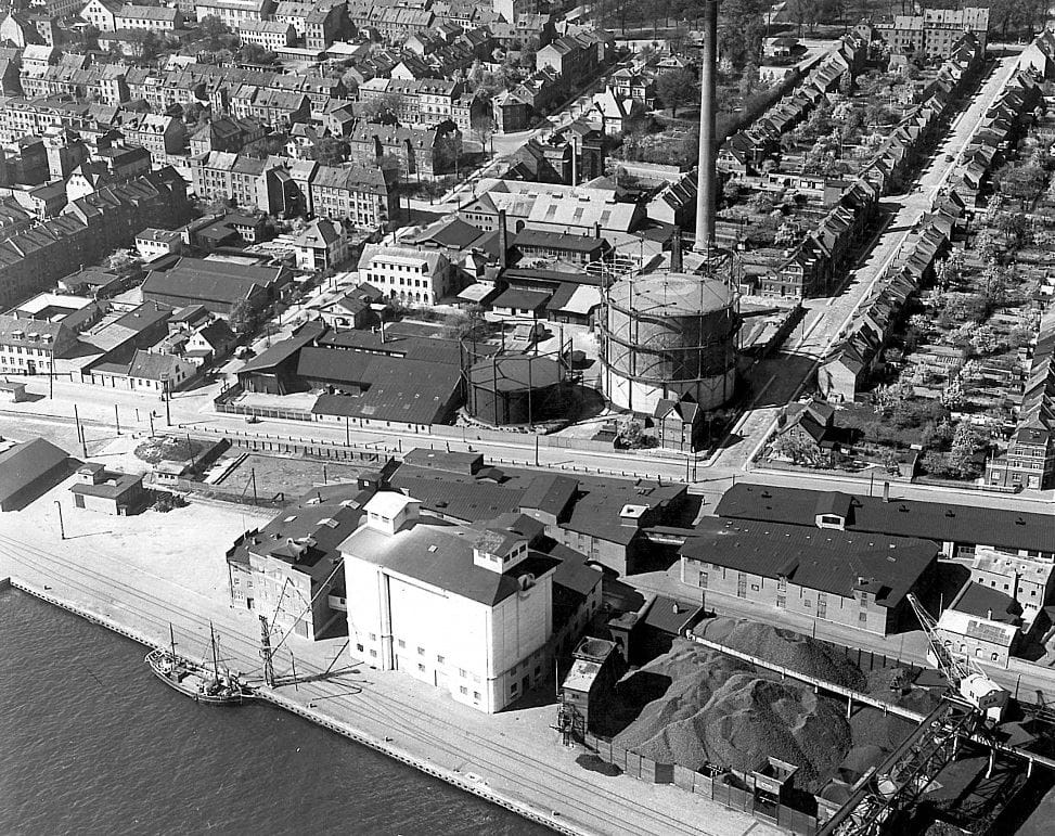 Udsnit af luftfoto af Nordhavnen, 1930. Den hvide silobygning blev senere sammenbygget med Danafeeds nyere bygninger. Foto: Industrimuseet, Horsens.