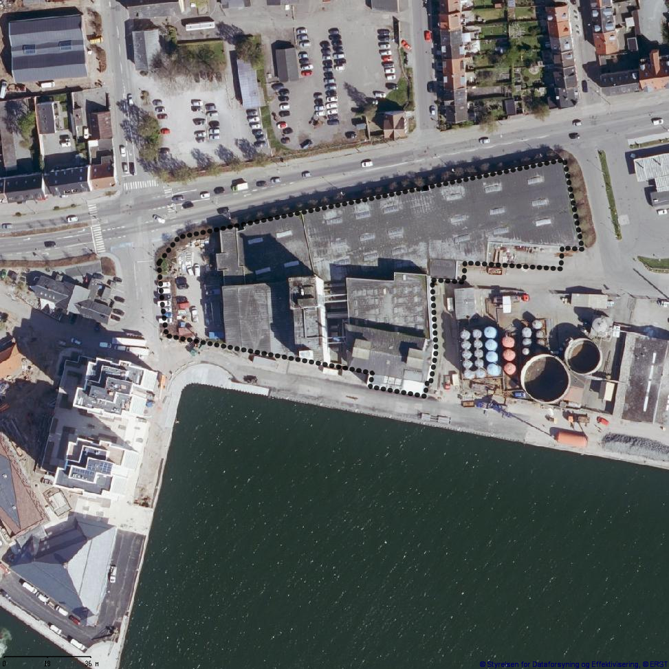 Ortofoto fra 2016 af lokalplanområdet og de nære omgivelser. Den stiplede linje er lokalplanens afgrænsning. Alle bygninger inden for lokalplanområdet tænkes nedrevet.