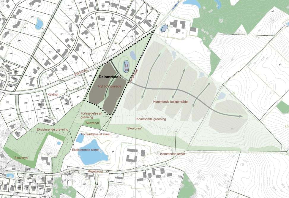 - Delområde 2 indeholder det nye boligområde.