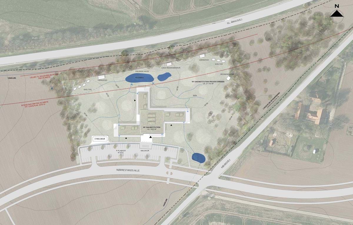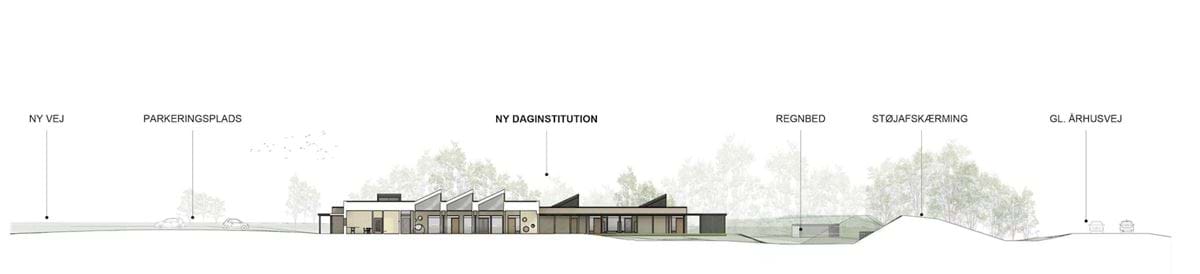 Bebyggelsen er disponeret, så den følger landskabets kurver, tæt på naturen, men samtidig tæt på byen. Dens planløsning som propel uden en entydig retning understøtter netop beliggenheden i midt i et bakket, grønt område og giver mulighed for en bred vifte af kontaktmuligheder mellem inde og ude, mellem institution og landskab. Formen er varieret i mindre aflæselige dele, så daginstitutionen i skala tilpasser sig naboskabet til den spredte bebyggelse syd øst for planområdet.