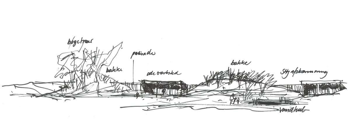 Landskabssnittet viser principper for støjafskærmning, regnvandsbed og bebyggelsens beliggenhed i landskabet