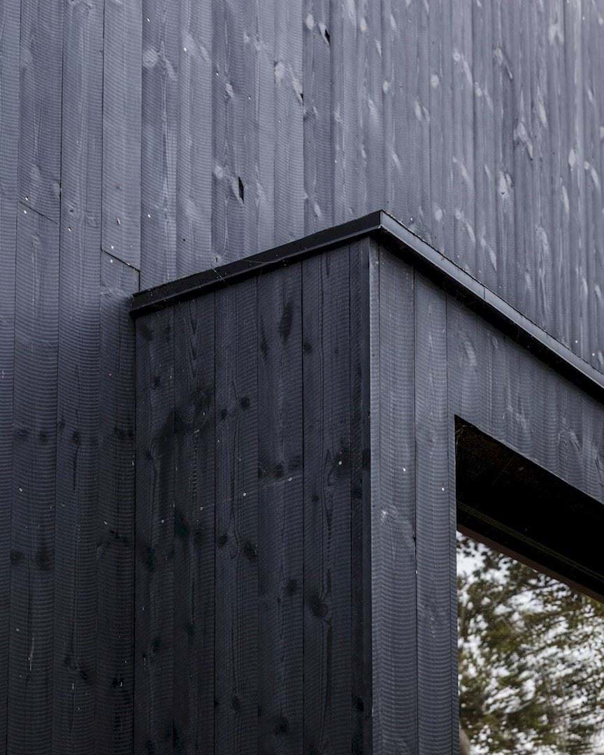 Illustrationerne viser byggeriet udtryk i en vekslen mellem sort eller mørkegråt bejset træ eller ubehandlet træ.