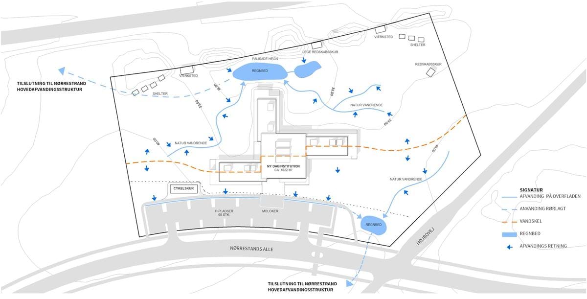 I lokalplanen får nedbør og ekstremregn en rekreativ værdi for områdets funktioner og værdi for øget biodiversitet. En landskabsbaseret afvanding med åbne kanaler/wadier og regnvandsbassiner på de lavest beliggende arealer sikrer, at vandet får plads og kan udledes til det centrale regnvandssystem i passende mængder.