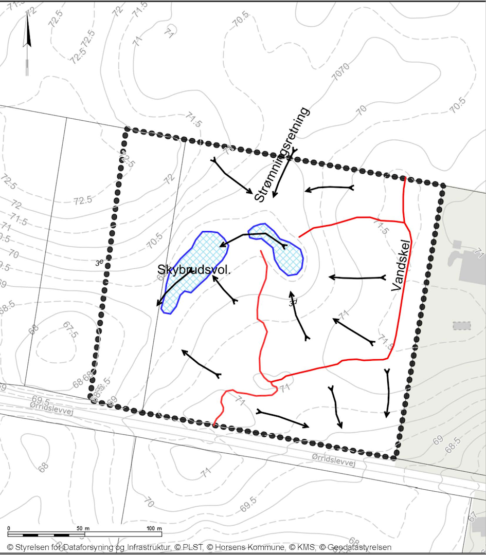 Princip for afstrømning af vand på terræn samt skybrudsvolumener.