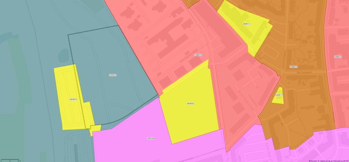 Kommuneplanramme 10OF03 fastlægger området anvendelse til offentlige formål, parkering i konstruktion.