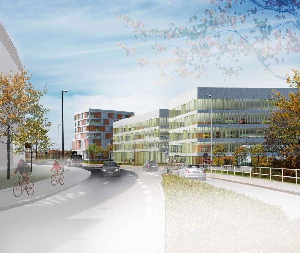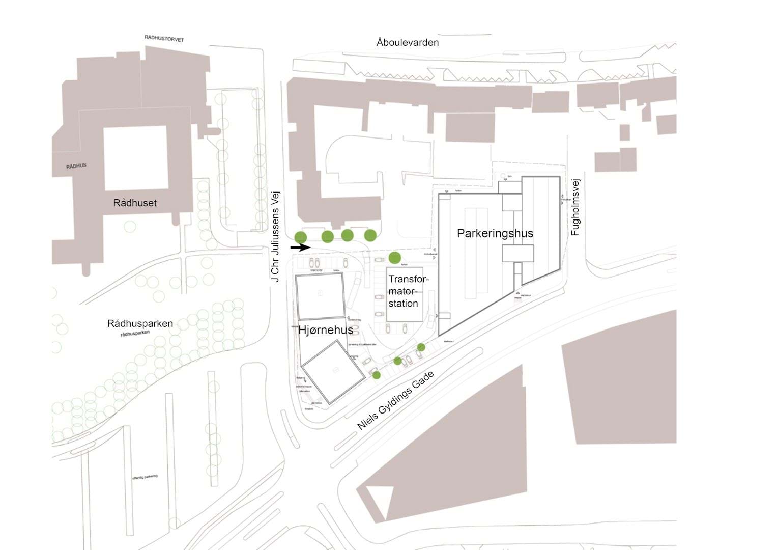 Der vil være ind- og udkørsel til p-huset fra J. Chr. Juliussens Vej og udkørsel til Niels Gyldings Gade via Fugholmsvej.