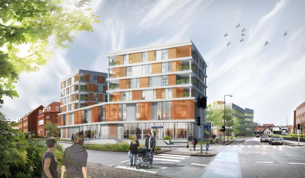 Bykernen fremstår hovedsagelig i teglsten, mens det nye bycenter syd for Niels Gyldings Gade er karakteriseret ved en mere blandet fremtoning, dog også med en hovedvægt af teglstensfacader. Det er valgt, at farveholdningen fra de omgivende bygninger, Rådhuset, bygningerne langs J Chr Juliussens Vej mv. videreføres i den nye bebyggelse for at forstærke den visuelle sammenhæng til bykernen. Facaderne vil derfor overvejende fremtræde i en mørk eller teglrød farve bestående af facadeelementer i beton, suppleret med stål-/aluminiums- eller træskodder og solafskærmning. Solafskærmning og læskodder vil være en vigtig og integreret del af arkitekturen ved både boliger og butik.