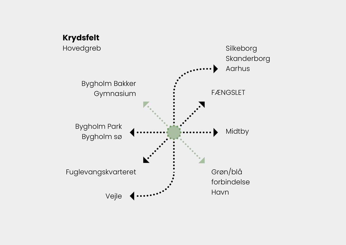 Det er vigtigt at sikre nye forbindelser både nord-syd og øst-vest i området, så området kobles tættere sammen med den øvrige Horsens by; Campus og det nye stor-gymnasium nord for Bygholm Park.