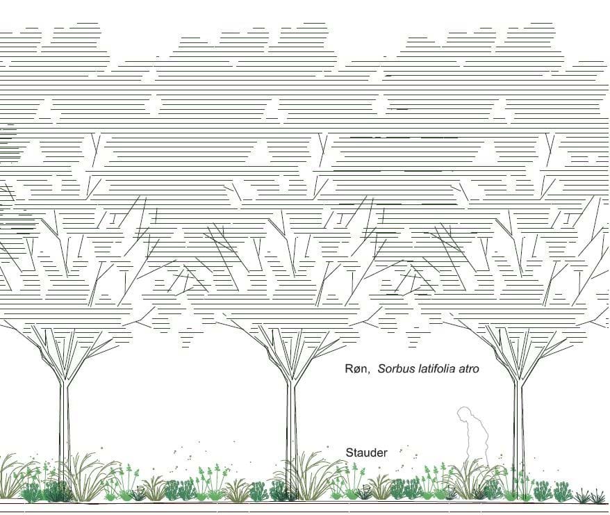 Der arbejdes generelt med trætyper som er karakteristiske for banearealer og stationer herunder særligt røn og eg. I overgangen mellem bane og bebyggelsen plantes spredte grupper af æble/vildæble.