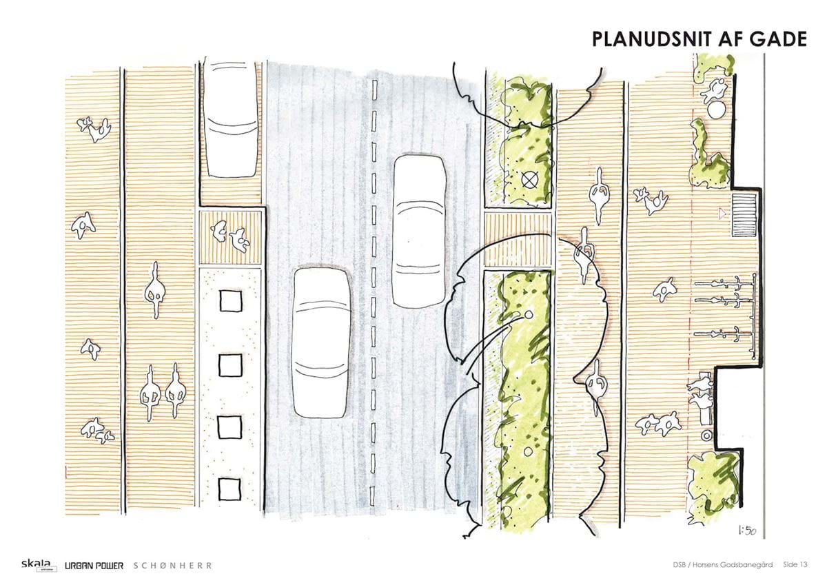 Princip for Banegårdsgade, beplantning, regnbede, belysning og indkørsler.