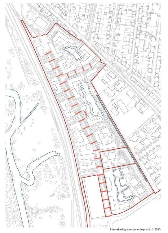 Intervalinddelingen angiver hvor beplantningen og belysningen i den kommende gade skal placeres og sikrer dermed at der kan udføres en jævn og ensartet begrønning og belysning af gaden uafhængig af kommende byggerier og etapevis udførelse.