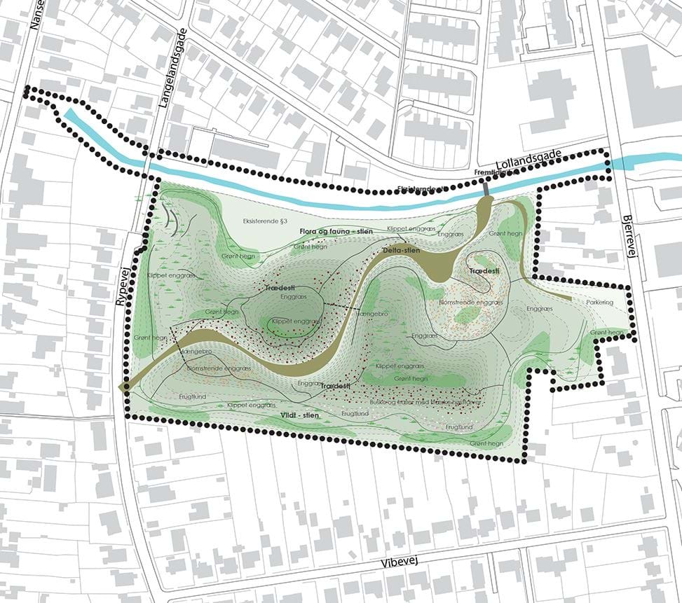 Lokalplanens fastlægger principperne for omdannelsen af det ubebyggede areal, som er en tidligere losseplads kan omdannes til et rekreativt landskab i form af en offentlig park med et markant kuperet landskab. I området udlægges forskellige typer stier, der sikrer en gennemgående forbindelse gennem området samt tilgængeligheden mellem de forskellige aktivitets- og opholdsområder. Lokalplanen sikrer desuden, at aktivitetsområderne placeres i bakkelandskabet på steder, hvor der skabes særligt gode muligheder for leg og ophold. Udformningen af landskabet skal ske med udgangspunkt i illustrationsplanen for området, der viser, hvordan området sammen med en varieret beplantning kan gives en oplevelsesrig karakter.