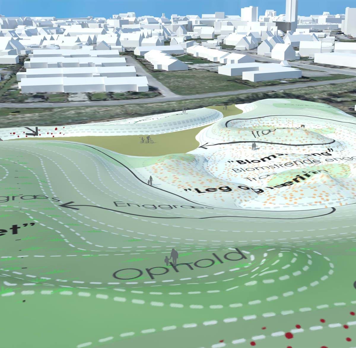 Udformningen af områdets rekreative landskab består af et kuperet terræn, der kan etableres ved et jordpåfyld med ca. 161.000 m3. Terrænet udformes som et varieret landskab, i hvilket der der etableres to bakketoppe, der begge har toppunkt vest for lokalplanområdets midte. Den ene bakke kan etableres i op til 10 meters højde over det eksisterende terræn. Den anden har en bredere udformning og placeres med topkote i den sydvestlige del af området i op til 9 meters højde over eksisterende terræn. Der er i udformningen taget hensyn til, at der ikke opstår indkigs- og skyggegener for nabobebyggelserne. Disse kan ses i bilag under 'Kort/Skitser'.