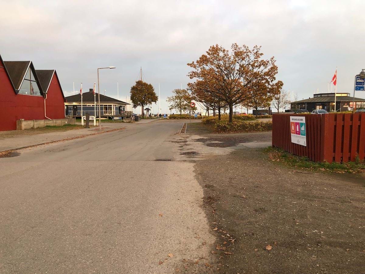 Marinaens landarealer er struktureret omkring hovedankomsten via Nordøstpassagen, der danner en central akse, hvorfra trafikken fordeler sig ud til parkering, stier og maritime faciliteter.