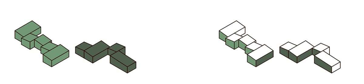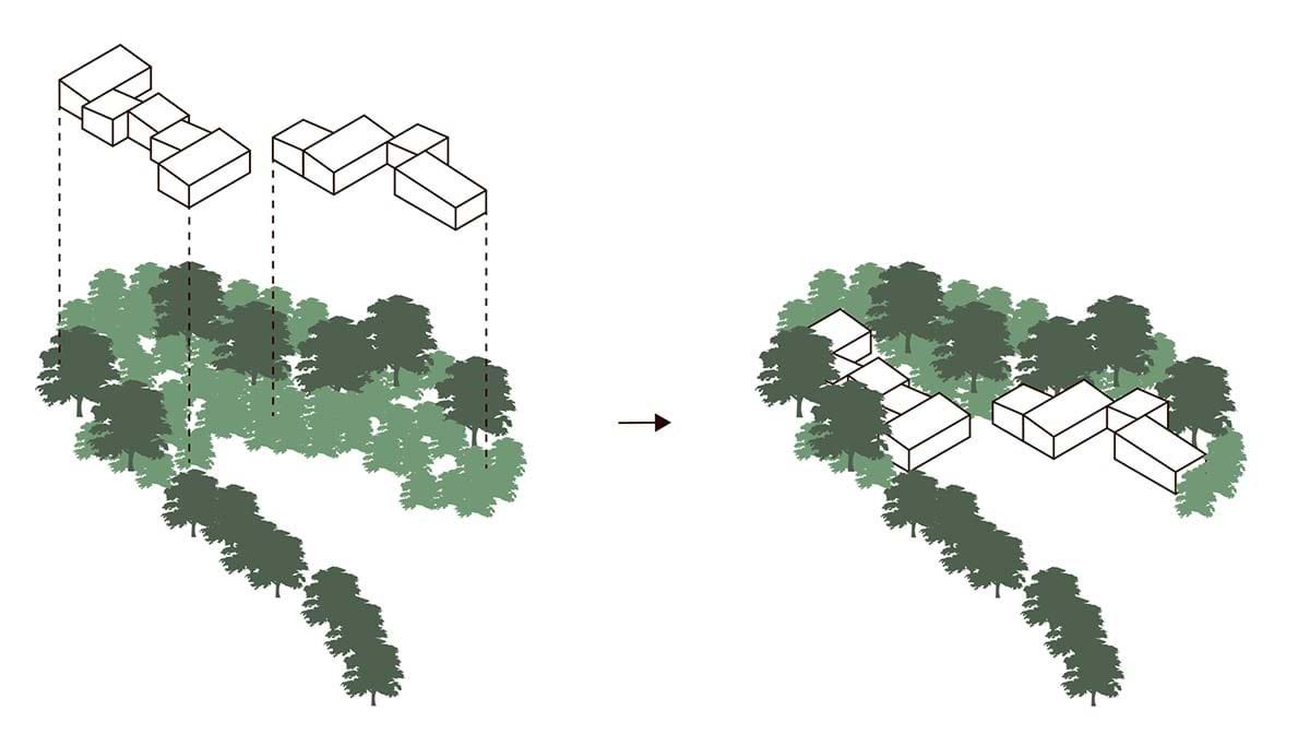 Diagrammerne viser, hvordan bebyggelsen indpasses i den eksisterende beplantning.