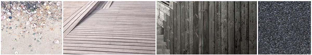 Materialer relaterer sig til sand, naturligt træ, mørkt eller brændt træ og asfalt.