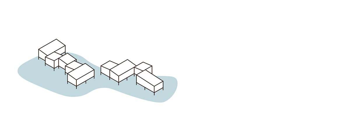Bebyggelsen hæves over terræn. Langs den hævede bebyggelse integreres siddemuligheder og et multimøbel. Multimøblet består af kvadrater, som på udvalgte steder er delt i diagonalen, så de herfra kan bevæge sig i flere retninger og tilpasse sig kystlandskabet for til sidst af tone sig ud og forsvinde i et med den stedlige natur.