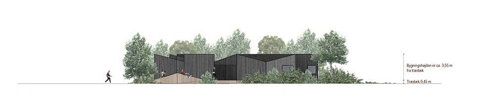 Bygningerne orienterer sig mod omgivelserne. Facade mod syd og vest inviterer brugerne af området til ophold på en bænk, som er en del af bebyggelsens arkitektoniske udtryk.