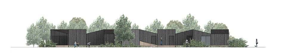 Facade mod græsareal/eksisterende krat, hvor bygningen bliver skærmet af beplantningen.