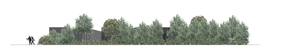 Facaden mod kysten er det mindste facadeareal og er delvist skjult i beplantningen. På illustrationens højre side kan man se saunaens vinduer samt vinduer til grej- og undervisningsrum.