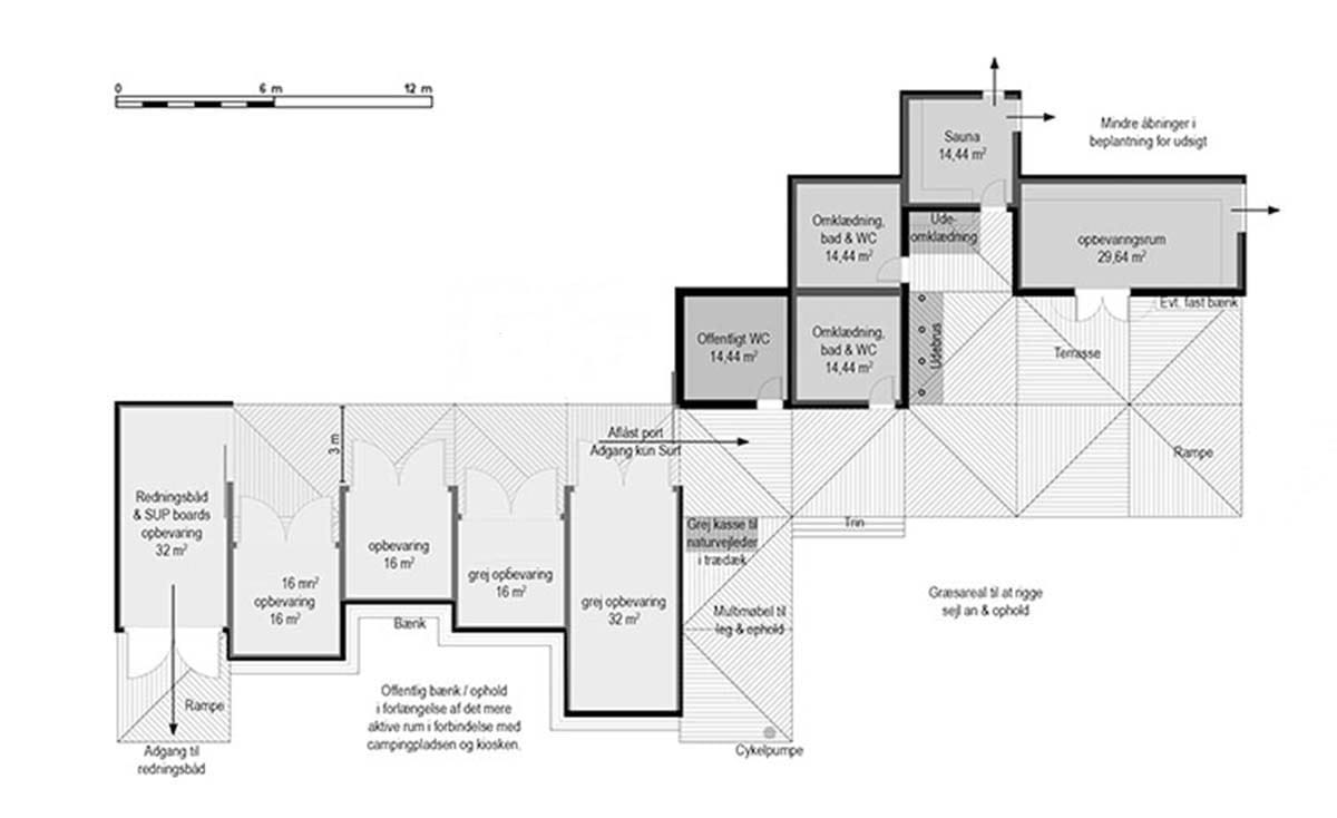Bygningskroppen længst mod nord og tættest på campingpladsen er disponeret til surfgrej. Her er der dels rum til opbevaring af surf- og supboards, feul- og sejltilbehør. Nordligste bygningsvolumen rummer plads til en redningsbåd, som understøtter klubaktiviteterne. Bygningen har direkte adgang fra Husoddevej. Bygningskroppen længst mod syd åbner sig op mod omgivelserne og det kystnære rekreative område. Her findes badefaciliteter, offentligt toilet, sauna og lokale til grej og undervisning.