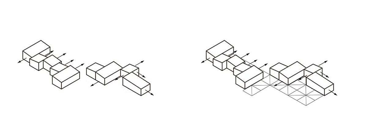Selvom multihuset er sammensat af 10 mindre skure med taghældninger, som hælder og orienterer sig i flere retninger, fremstår det som en samlet bebyggelse, som kun er adskilt for at kunne transportere grej frem og tilbage.