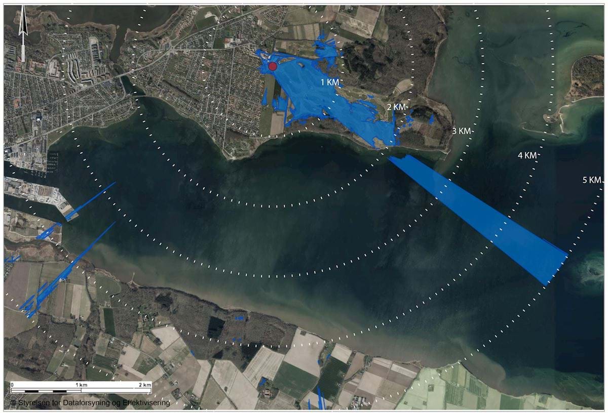 De nye bebyggelser opføres i maksimalt 8,5 meters højde jf. § 8.2, og vil kun kunne blive set fra kysten ca. 2 km. væk, som det også kan ses på nedenstående billede, som er en synlighedsanalyse, hvor de blå arealer er hvorfra projektet vil være synligt. Se evt. billederne 2A, 2B og 2C i afsnittet om beliggenhed og eksisterende forhold, som er taget fra Husoddestien langs kysten med blikket rettet imod lokalplanområdet.