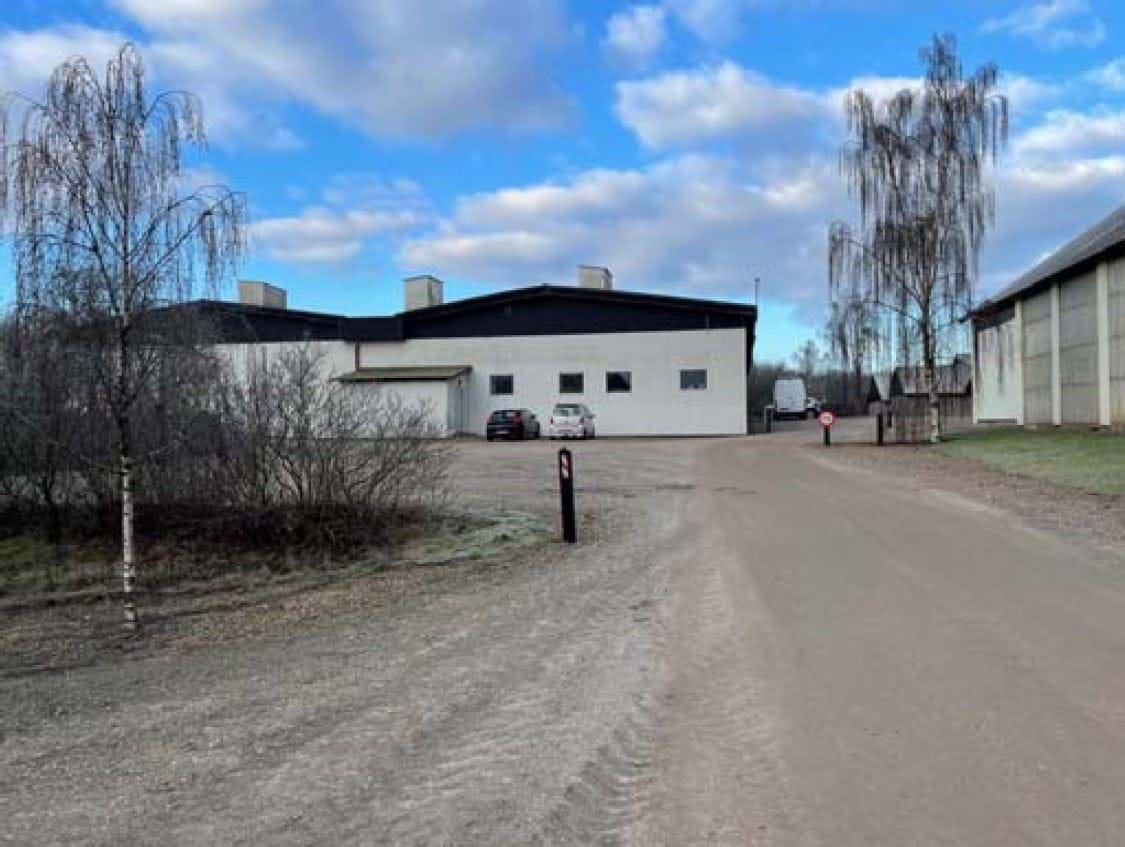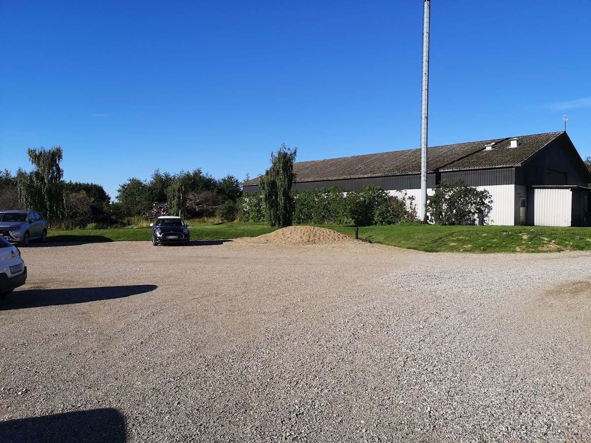 Billede 1C viser den eksisterende lagerbygning/flishal, der ønskes forlænget. Forlængelsen skal ske på et område, der i dag er et uudnyttet græsareal.
