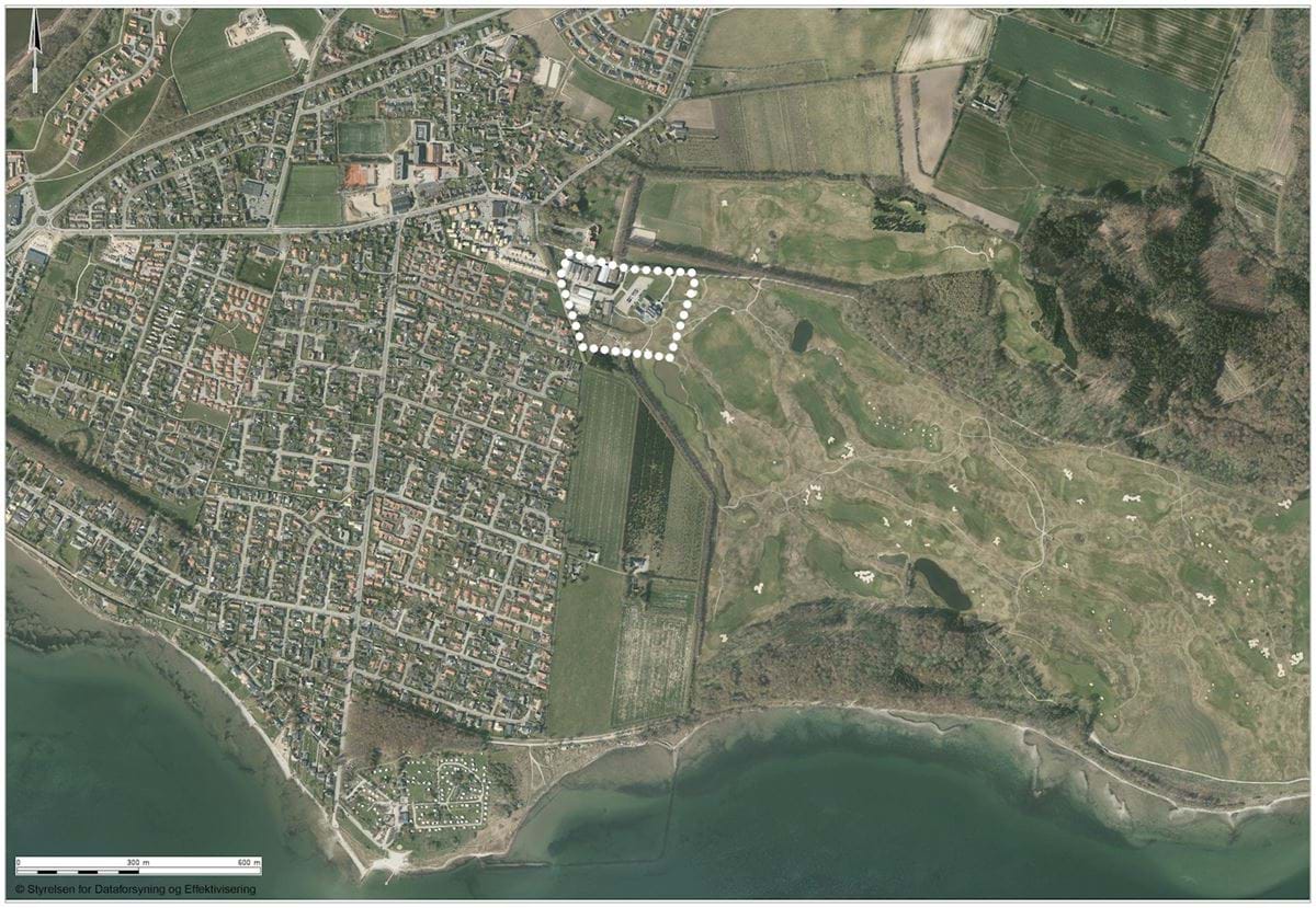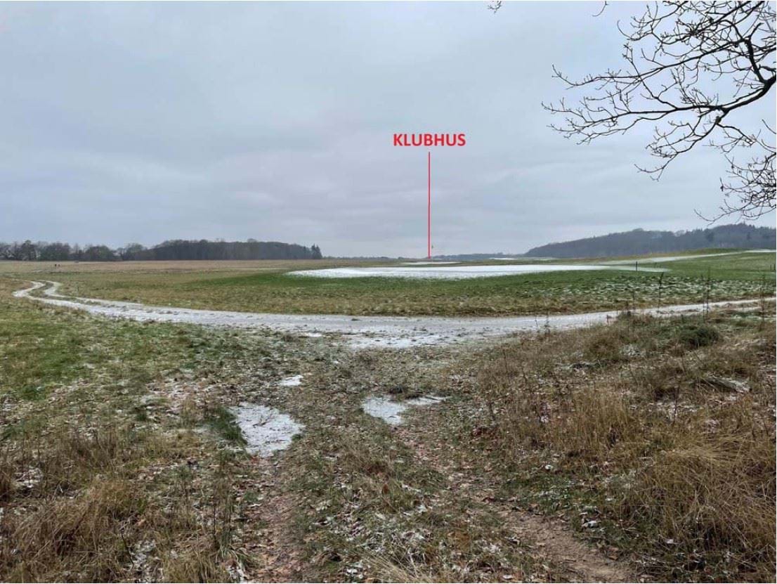 På billedet ses en klynge gårde, der også er markeret på kortet. Gårdene ligger på en bakketop, ca. i kote 25, og er beliggende ca. 430 m. fra registreringsstedet. Fra registreringsstedet er der ca. 1000 m. til den ny padelhal hvor terrænforholdene her er ca. kote 24. Det nuværende klubhus kan således ikke ses fra Husoddestien. Dette er også gældende for den nye hal til padeltennis de nye hotellejligheder, som heller ikke ville kunne blive set fra stien.