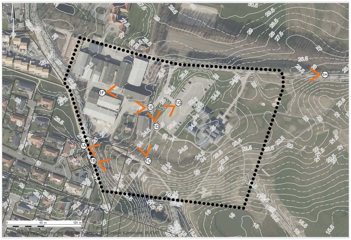Nedenfor ses et kort over lokalplanområdet, hvorpå der er markeret 8 registreringspunkter.