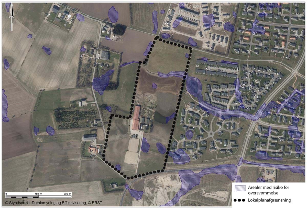 Indenfor lokalplanområdet er der udpeget flere områder, hvor der kan være risiko for oversvømmelse, se nedenstående kort. Ny bebyggelse placeres derfor mht. dette jf. byggefelt A og B, kortbilag 3.