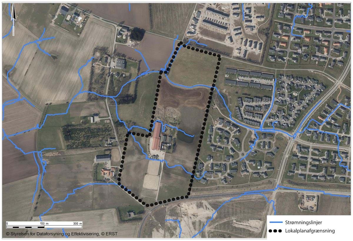 Indenfor delområde 2 jf. kortbilag 1A er der i dag en hovedstrømningslinje der afvander 4,6 ha. opland fra det østlige naboområde, som går gennem placeringen for byggefelt B jf. kortbilag 3. Der kan desuden være risiko for at regnvand samler sig i betydelige lavninger øst for og omkring den nye planlagte bygning. Der kan være risiko for oversvømmelse ved kraftig nedbør både under og efter etableringen.