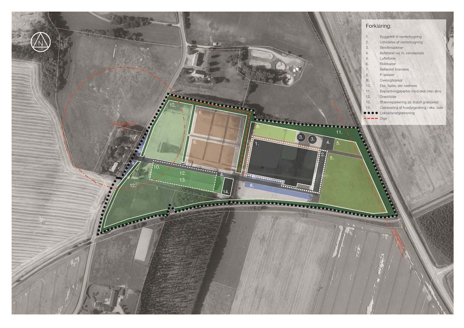 Lokalplanen giver mulighed for at nedrive de bestående bygninger og bygge et nyt ridecenter som angivet på illustrationsplanen nedenfor. Det vil være en betingelse, at de eksisterende bygninger nedrives senest når de nye tages i brug.