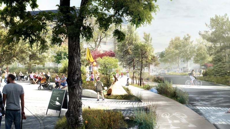 Lokalplanen skaber mulighed for, at der arbejdes med tilbageholdelse, forsinkelse og nedsivning af regnvand. Klimasikring kan integreres i og bidrage på spændende vis til byrummene.