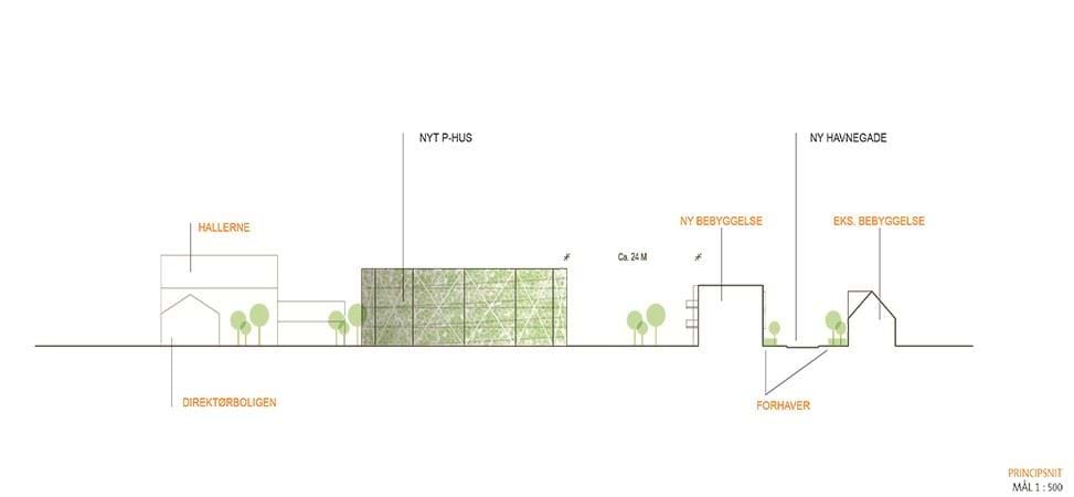 Der etableres parkering i en cirkulær bygning. Det planlagte parkeringsbyggeri bliver et synligt byggeri fra Niels Gyldings Gade og fra Havneområdet. Byggeriet skal fremstå imødekommende og der skal sikres en høj arkitektonisk kvalitet med tilpasning til områdets bygninger og karakter. Byggeriet skal fremstå luftig og venlig med belyste samt grønne facader. Parkeringshusets facader skal dermed aktivt bidrage til området. Facaderne skal udformes med f.eks. fokus på belysning/lysinstallation, konstruktion eller andre spændende virkemidler, som flettes sammen med en høj grad af facadebegrønning.