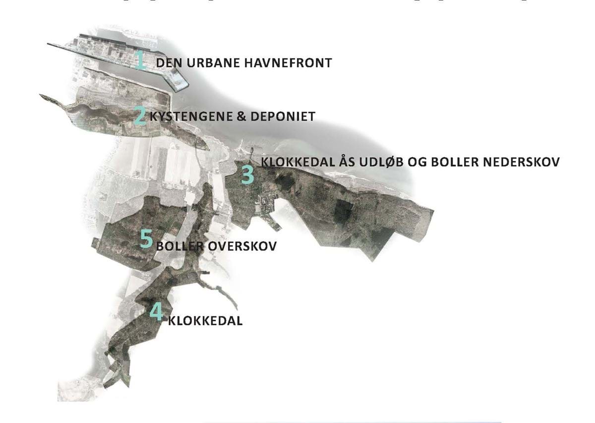 3) Før ringvejens krydsning med Bollervej passeres, øst for ringvejen, Boller nederskov og Klokkedal Å´s udløb. Kystlandskabet her består i dag af marker og læhegn. Bollerstien er i dag den eksisterende forbindelse til dette område.